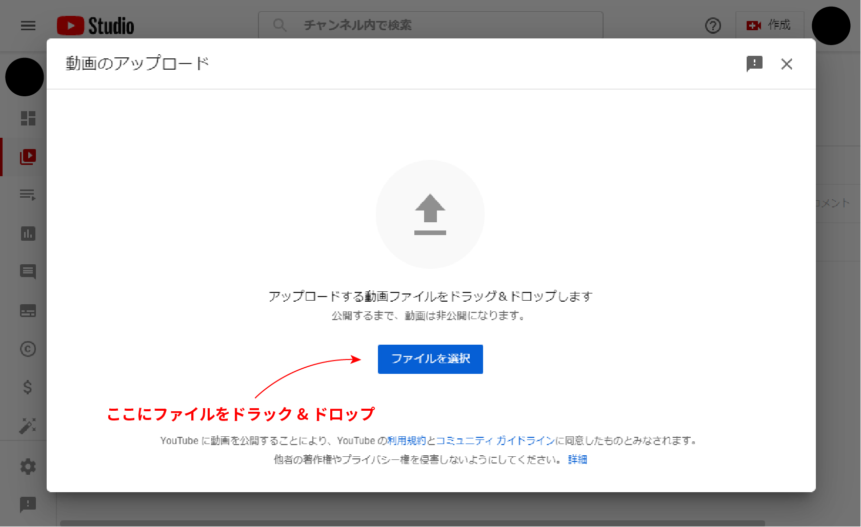 動画をアップロードをクリックすると画像のようなポップアップが出てくるので、実際に投稿する動画ファイルをドラッグ&ドロップで選択します。