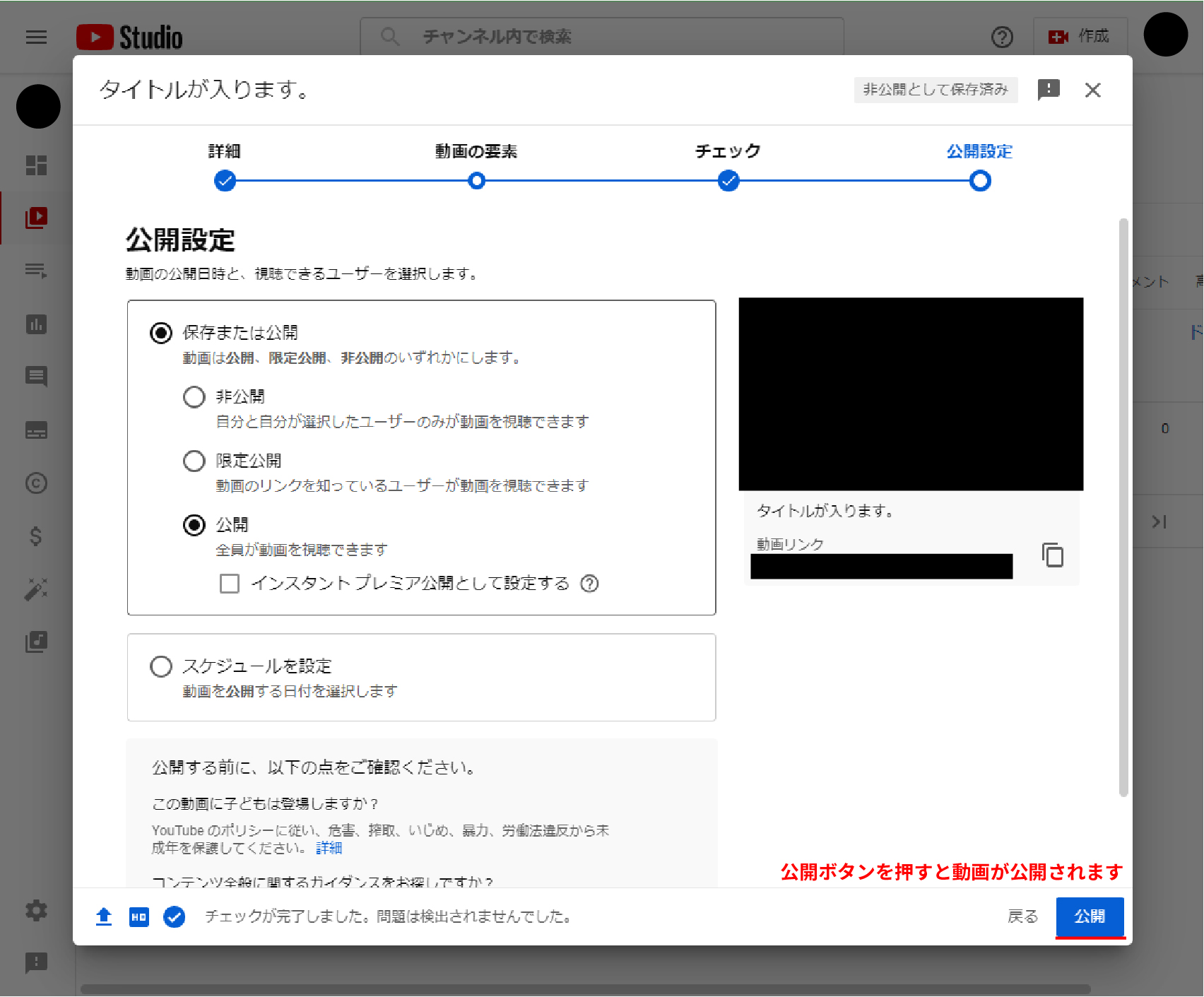 動画を投稿する準備が整ったらいつ公開するか、誰に公開するかを設定します。