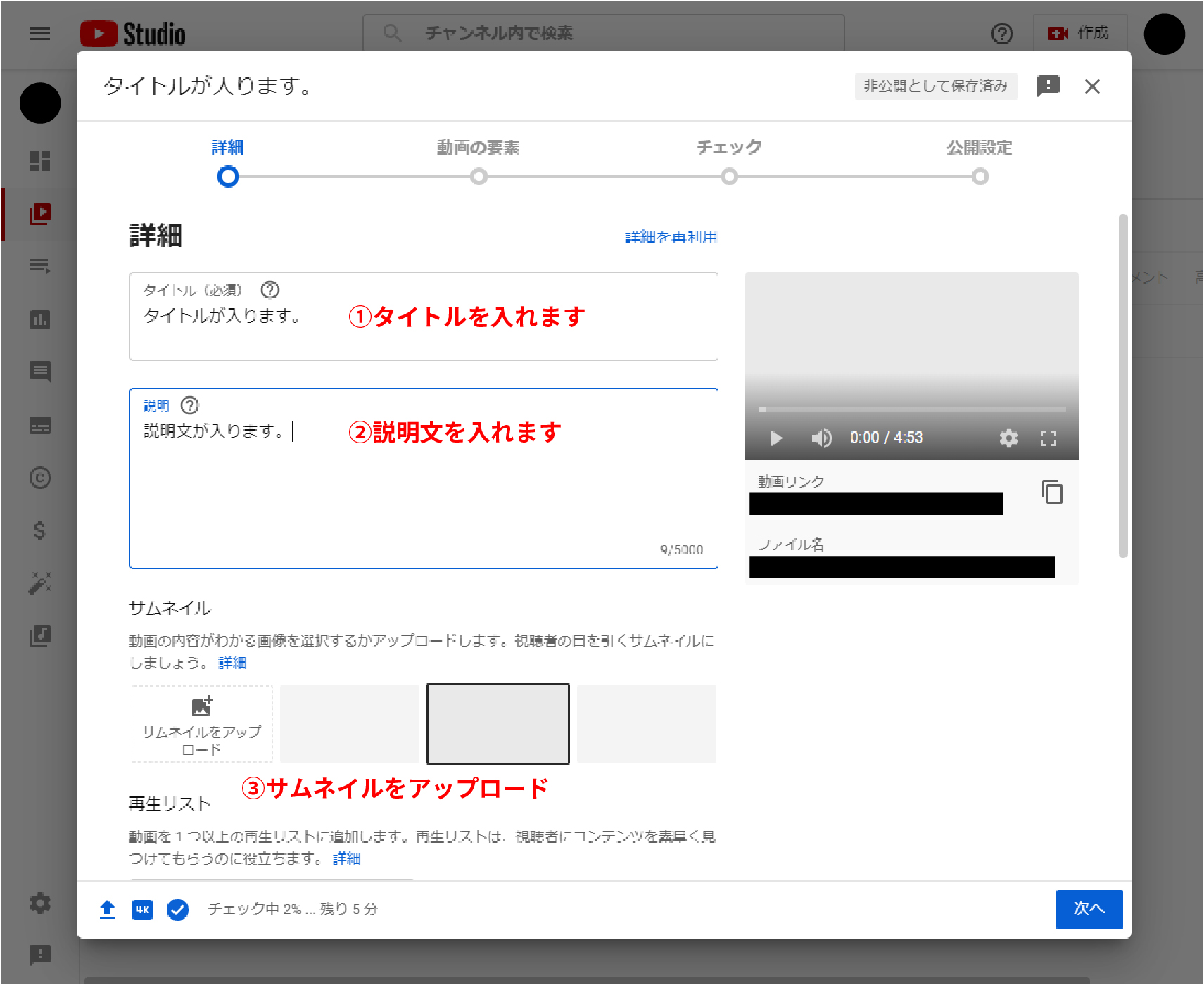 こちらの画面では動画のタイトル、説明文、サムネイルを設定します。
