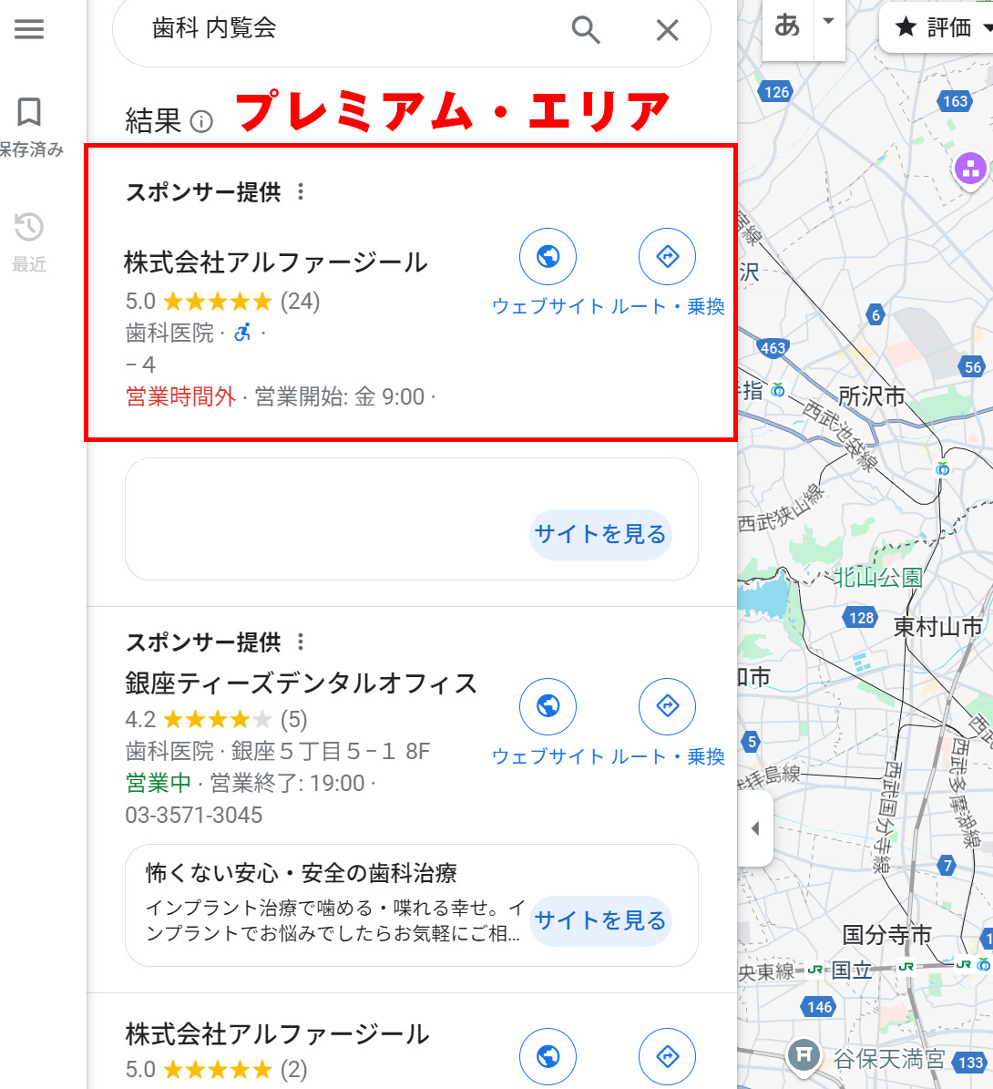 今回、当社が提供するのは通常のGoogleウェブ検索とGoogleMAP検索の両方の上位プレミアム・エリアに掲載するサービスを提供します。