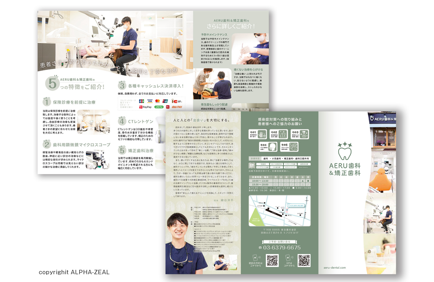 3つ折りリーフレットは医院の看板などに設置することで情報発信ツールにもなります。見やすくて予約を入れたくなるような、患者さまとの信頼関係を築けるリーフレットをお作りします。用途を分けて「医院情報」「自由診療」などの複数注文にはお値引きも御座います。